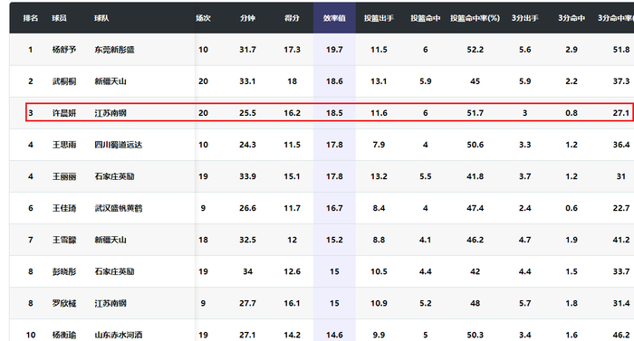 许晨妍最近两年都是WCBA联赛表现最好的内线球员之一。可惜她在2025年没有被宫鲁鸣征召进中国女篮。许晨妍上赛季场均得到15.0分7.7篮板1.7助攻,效率值18.5。
